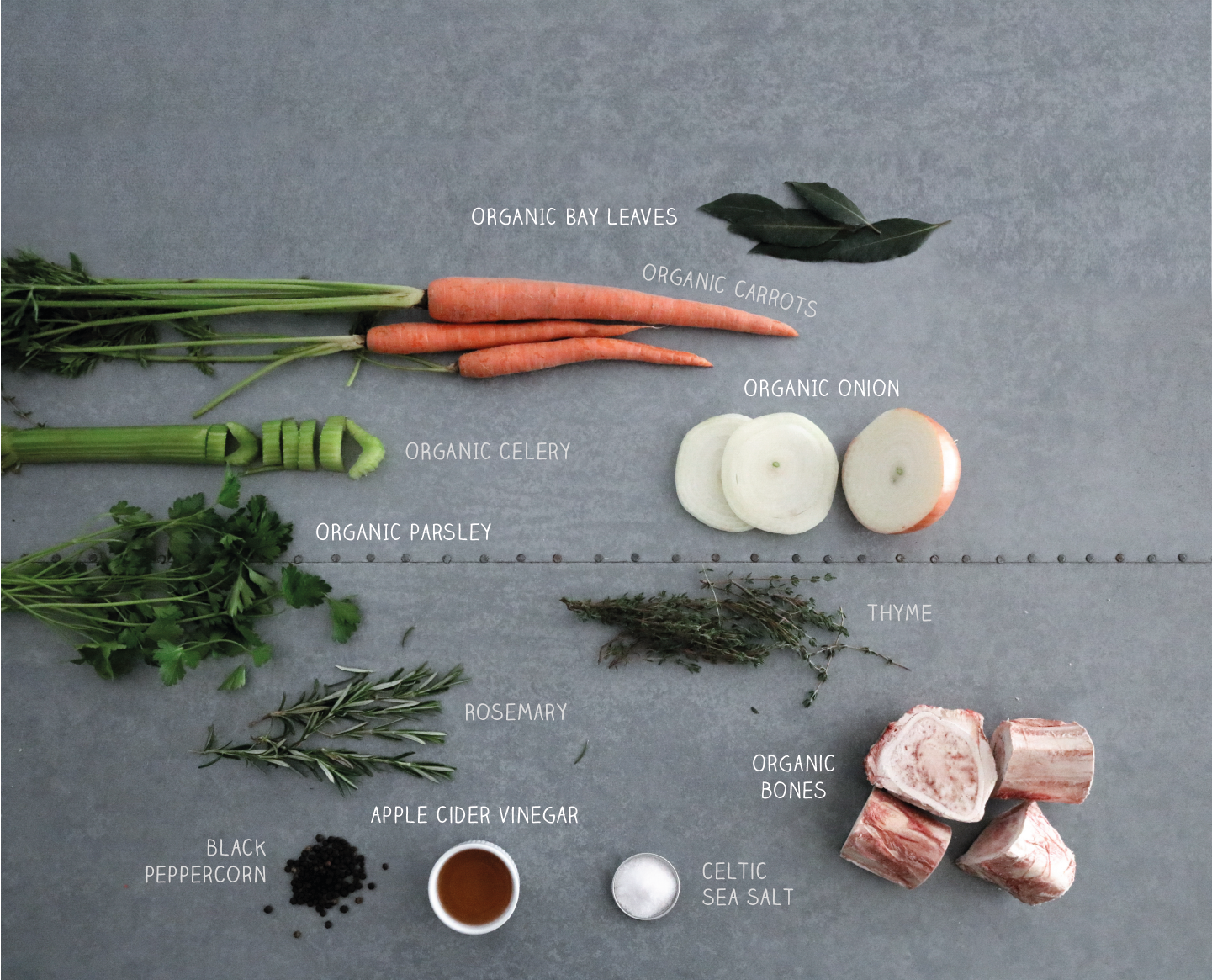 Marrow bones from pasture-raised, 100% grass-fed cattle, organic carrots, organic onions, organic celery, organic bay leaves, organic parsley, apple cider vinegar, a pinch of black peppercorn, sea salt, and thyme.